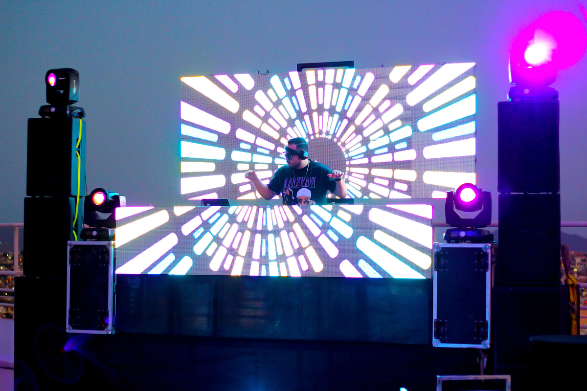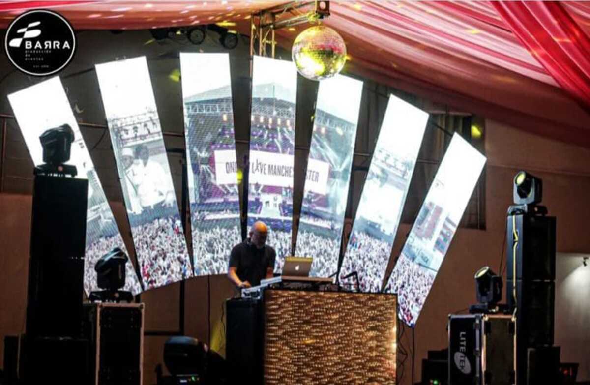 15 mtrs de pantalla 8 beams, templete, dj, maquina de humo, láser.